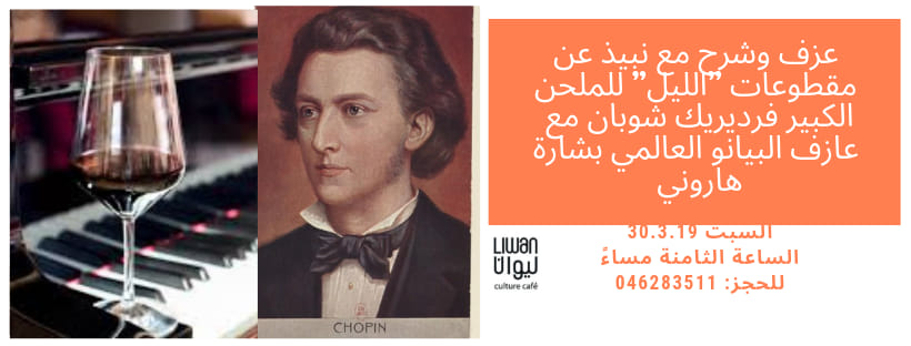Wine and melody pink...Liwan Cafe hosts Chopin! In a special evening, with the world pianistBishara Harouni.Saturday 30/03/19.20:00.Liwan Cultural CafeThe Old City Market in Nazareth reservations: 046283511